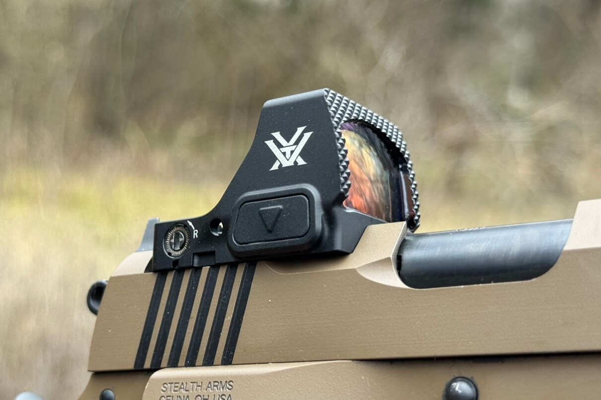 I think the new Vortex Defender-ST is proving to be a solid option for everything from EDC to competition shooting. This red dot has an MSRP of $469.99 and should have a street price of around $330. It also comes with a Picatinny mount right from the factory. The red dot utilizes the common DeltaPoint Pro footprint and features a large clear window contained in a rugged housing. Add in a top-loading battery, tactile adjustments, a unique front Fast-Rack™ front face, and good durability, this is a solid-performing optic at a competitive price.