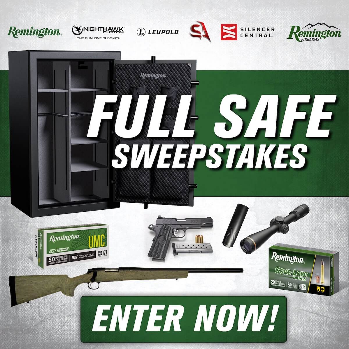 FULL SAFE SWEEPSTAKES (“Sweepstakes”) starts at 8:00AM CT 2.15.24 and ends at 8:00AM CT 3.11.24. For How to Enter, Complete Eligibility Requirements, Prizes, Odds of Winning, and Full Official Rules, visit SWEEPSTAKES WEBSITE. Sponsor: Ammunition Operations LLC d/b/a Remington Ammunition, 2592 AR-15 N Lonoke, AR 72086.