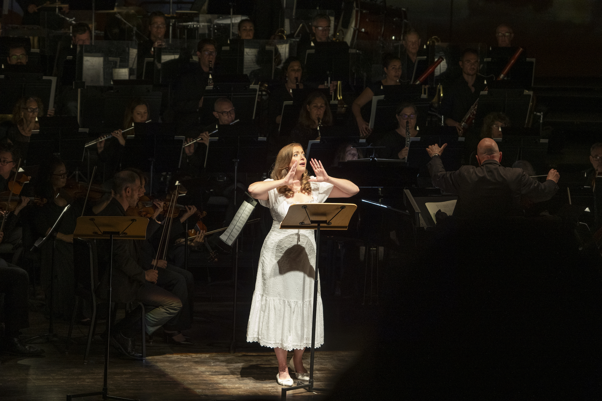 As is typical for Summerscape, this opera was presented semi-staged, smoothly directed by Marco Nisticò. John Horzen’s projection and video design was both striking and clever, providing the necessary visual component in crafting this surreal world. A particularly nice touch: the setting for the town first appears as a line drawing, only to be slowly filled in as we meet more and more of the strange townsfolk.