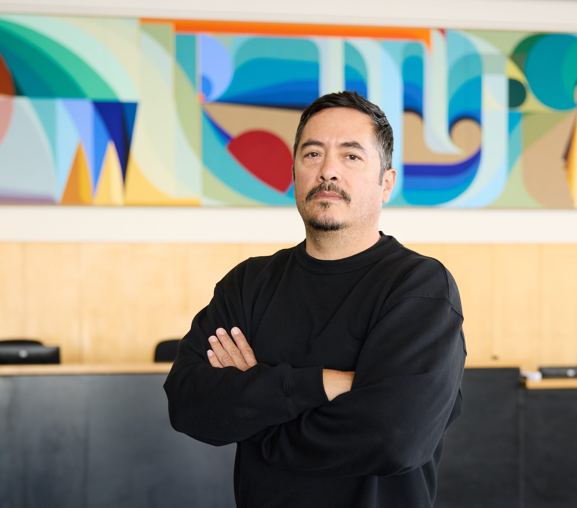 Similarly, Ore-Giron synthesizes Latin American folk music such as Cumbia with the esoteric production techniques of artists such as MF DOOM. “I think it had a profound impact on the way that I approach visual language as well,” Ore-Giron says, “because it made me want to look deeper into the histories of visual language in Latin America. On a conceptual level, that’s where the music and the art really are working together.” As such, on Ore-Giron’s grounded linen canvases, where abstraction meets figuration, antiquity meets modernity and a visual rhythm that rings above all, strong and resonant.