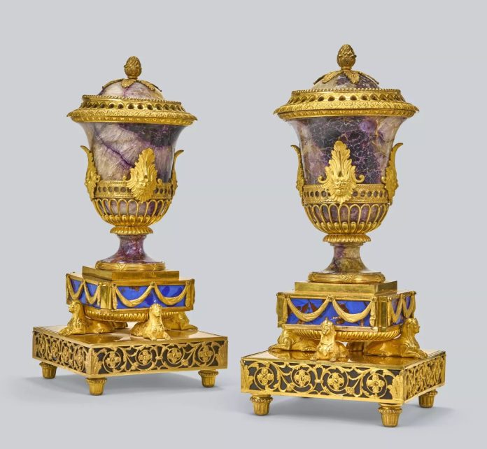 Rarities in the sale include the oeuvre of the 18th-century polymath Matthew Boulton, the co-developer of the steam engine and a preeminent purveyor of luxury goods whose patrons included Catherine the Great. Irene’s cache of Boulton examples is among the rarest and most important in the world, noted Strafford. Case in point: a pair of George III ormolu-mounted blue john candle vases is expected to achieve $80,000-120,000.