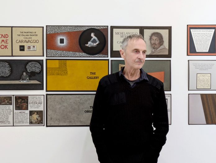 “A Friend Gave Me a Book” is a long-simmering work that has had multiple incarnations. During a 2006-2007 fellowship in Rome, Kelly stepped into the world of Caravaggio’s paintings through photography and videography. In 2011, he performed The Escape Artist at PS122, now Performance Space New York, speaking and singing about the ordeal against a three-channel video backdrop. The current set of illustrated panels began as storyboards he developed during summer residencies, which he then fleshed out in his apartment during COVID and completed in 2025 at a PS122 Gallery residency in the same building where The Escape Artist premiered.
