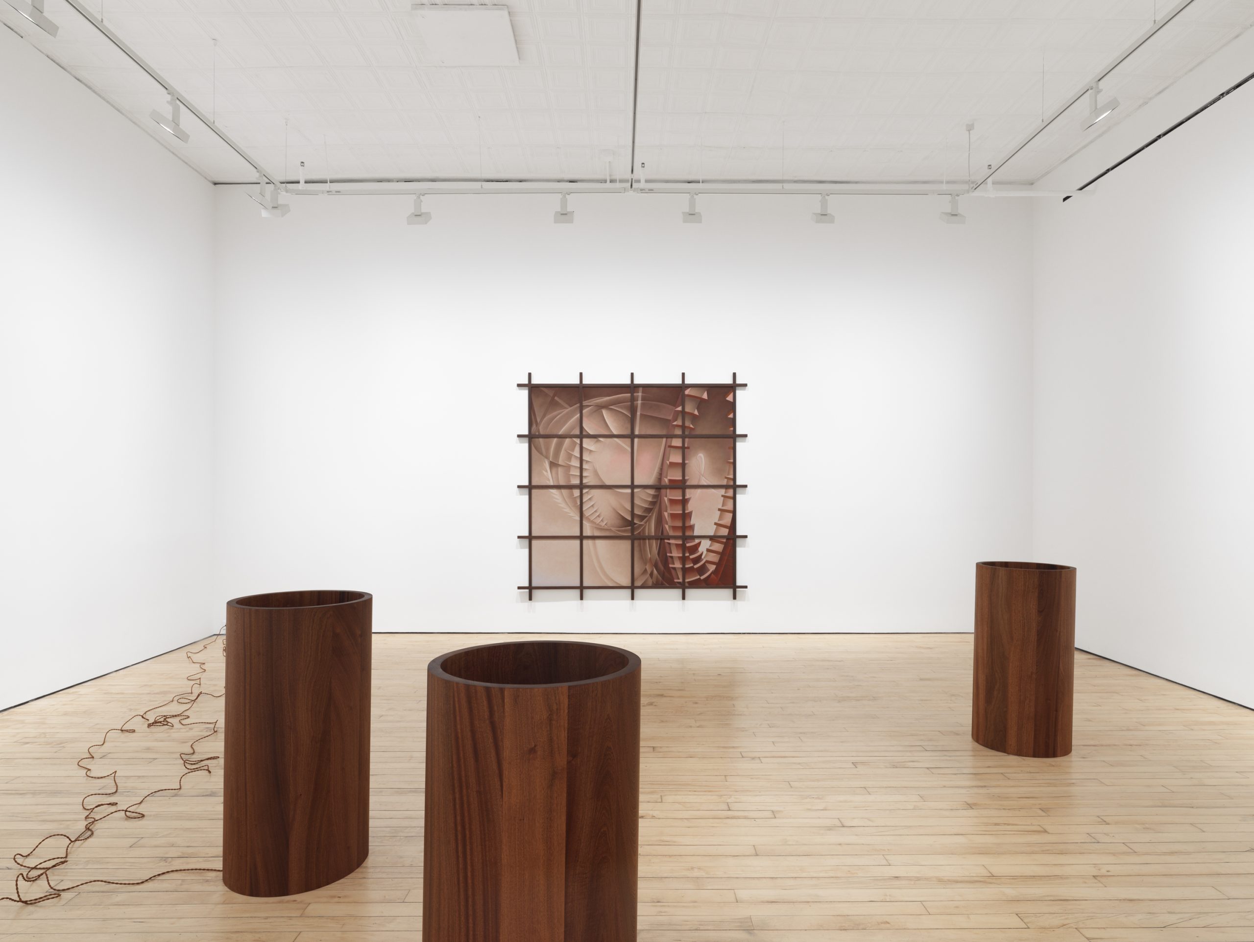 What is striking about Charlotte Edey’s work, particularly upon first encounter, is its ability to navigate—in masterfully crafted, physically tactile structures of wood and textile—the dialectical tension between inner and outer worlds, staging a fundamental inquiry into the interaction between body, psyche and environment. Already established in the U.K. and Europe, where she has exhibited widely in both commercial and private spaces, she recently made her East Coast debut at James Cohan with a new body of multimedia works in an exhibition titled “Corner/Fold.” The show brings together intricate abstract patterns, the sensory pleasure of needlework and the intense physical labor, precision, and endurance required by woodworking.