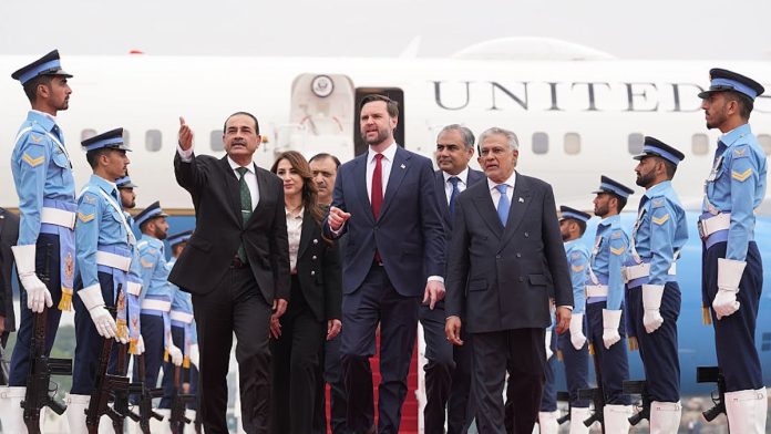 US Vice President JD Vance (L) talks to Pakistan’s Chief of Defence Forces and Chief of Army Staff Field Marshall Asim Munir (R) and Pakistan’s Deputy Prime Minister and Foreign Minister Mohammad Ishaq Dar (C) before boarding Air Force Two after attending talks on Iran in Islamabad on April 12, 2026. (Photo by Jacquelyn MARTIN / POOL / AFP via Getty Images)
